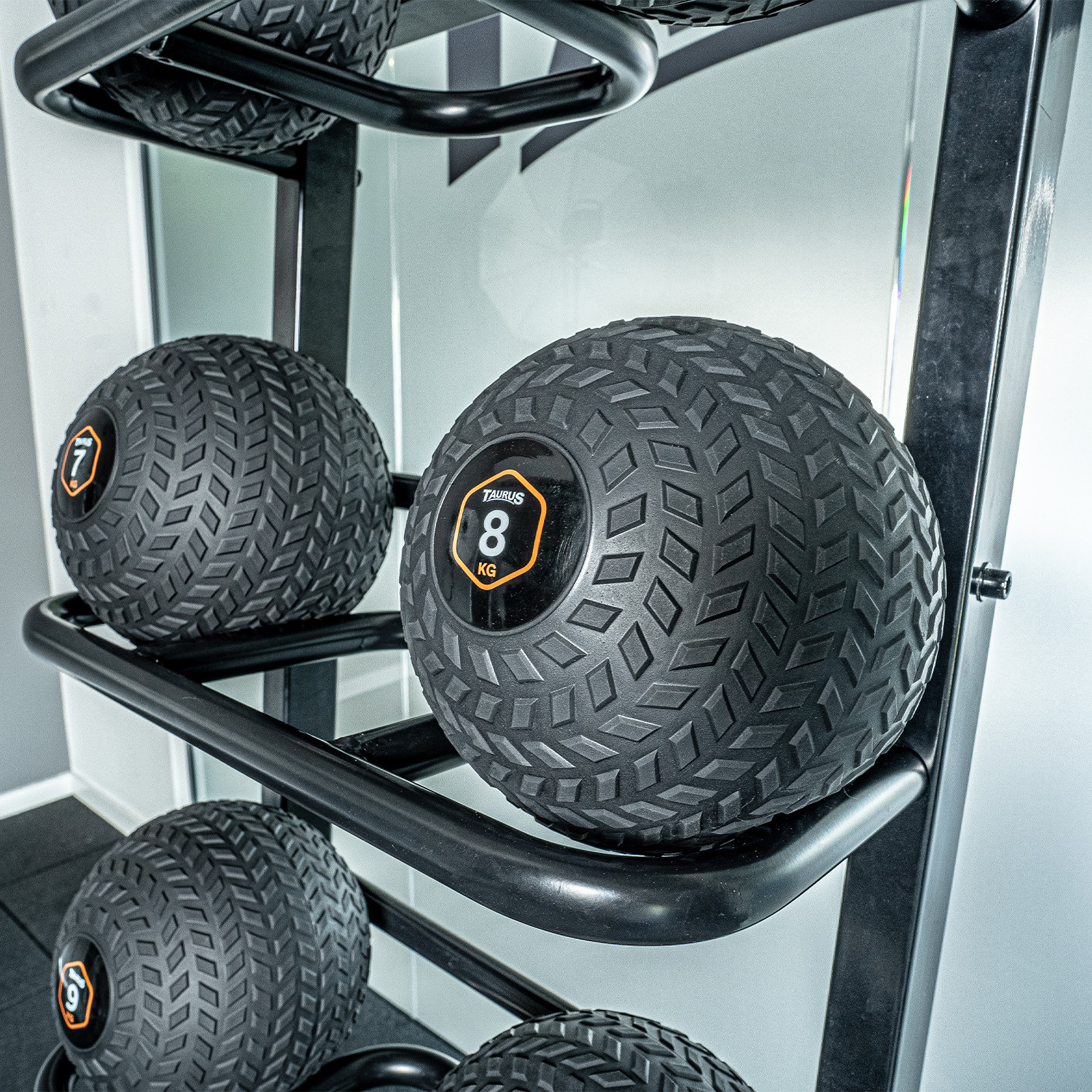 The Taurus Pro Functional Bag & Ball Storage Rack keeps your gym tidy and organised, holding up to five power bags or ten slam balls.
